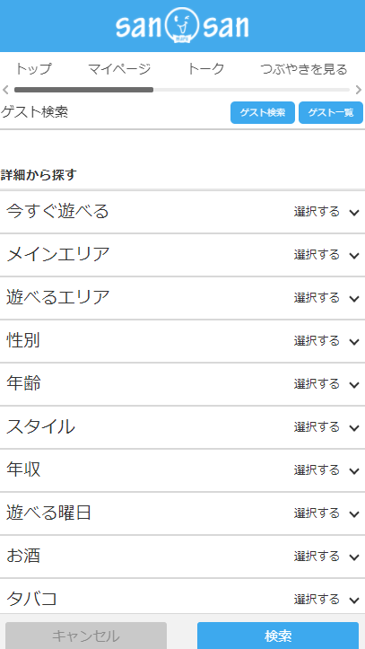 sanmarusanでゲストを探す際の定番検索方法がこちら、「詳細から探す」です。