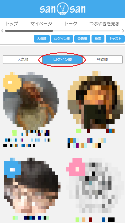 「ログイン順」をタップすれば、sanmarusanにログインしたゲストを最新順に表示させることができます。