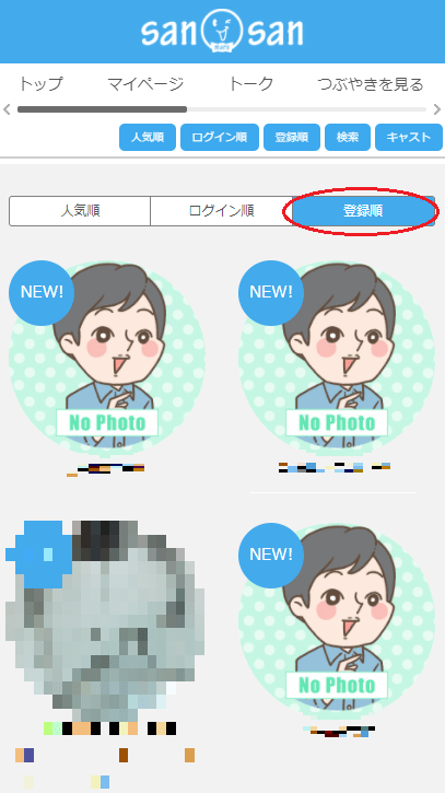 「登録順」をタップすると、登録ホヤホヤのご新規さんを順番にチェックすることができます。